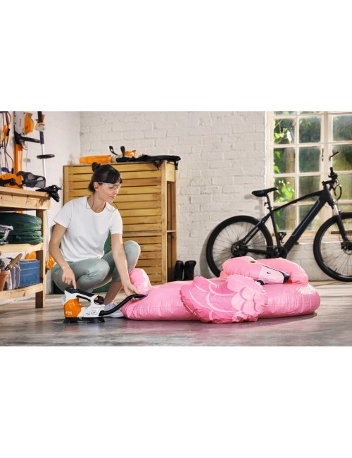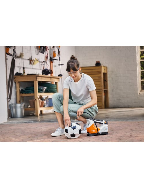 El compacto compresor de batería STIHL KOA 20 es ideal para inflar neumáticos de automóviles o bicicletas sin esfuerzo así como equipos de ocio y deporte como balones o botes hinchables. Funciona con una batería del sistema STIHL AS .